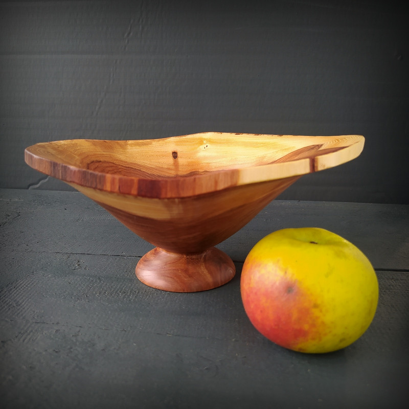 Dřevěná dekorativní miska na nožce, vhodná na ovoce či cokoliv suchého. Má "živý" přírodní okraj a kruhovou kresbu letokruhů kmene vzácného jilmu habrolistého, je tenkostěnná a točená kolem jádra.