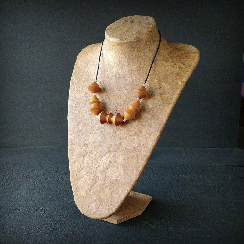 Výrazný náhrdelník z pěti dřevěných, exentricky soustružených dílů, jemně kolorovaných voskem.